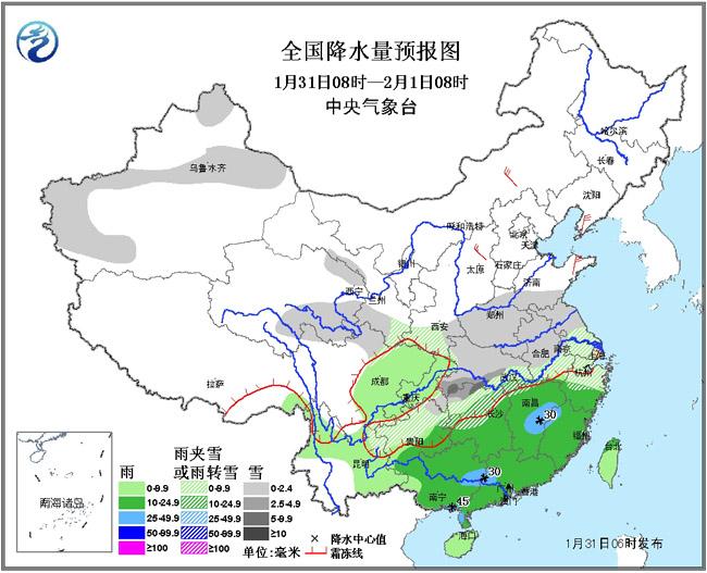 1月31日08時至2月1日08時,新疆北部和西南部、青海東部、陜西南部、甘肅南部、黃淮南部和西部、江淮、江漢、江南北部、貴州中北部等地有小到中雪或雨夾雪,局部有大雪;西南地區(qū)東部、云南東南部和北部、江南中南部、華南等地有小到中雨,其中,江西中部、廣西南部沿海和東北部、廣東西部等地的部分地區(qū)有大雨。臺灣海峽將有7~8級、陣風(fēng)9~10級的大風(fēng)。