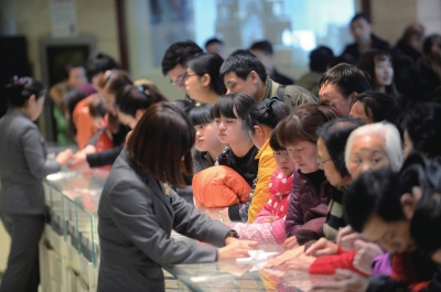 國際金價雖然一直上漲,但是北京菜百、國華等各大黃金賣場的報價都是按照節(jié)日期間已休市的上海黃金交易所價格確定,因此,節(jié)日期間黃金價格并沒有跟進(jìn)上漲,再加上春節(jié)本身就是黃金消費旺季,京城金店客流增大。