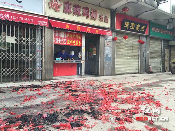 早上7點(diǎn)左右,可以聽(tīng)到外面的鞭炮聲,到了8點(diǎn),長(zhǎng)沙城區(qū)的鞭炮聲幾乎一陣接一陣。記者經(jīng)過(guò)車站南路、城南路、韶山南路一帶,看到街邊少數(shù)的店面已經(jīng)開(kāi)門營(yíng)業(yè),部分店面門口有燃放鞭炮,這些燃放鞭炮的店面主要集中在小型超市、汽修類門面、餐飲店、糖果副食品店等,有些店主選擇自己清掃后由環(huán)衛(wèi)工人運(yùn)走鞭炮垃圾。今天鞭炮燃放的時(shí)間集中在早上7-10點(diǎn),截至10點(diǎn),部分鞭炮灰已經(jīng)清掃完畢。