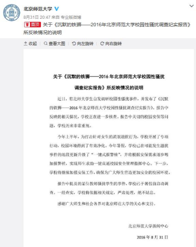 近日,有北師大學(xué)生自發(fā)調(diào)研校園性騷擾事件,并發(fā)布了《沉默的鐵獅——2016年北京師范大學(xué)校園性騷擾調(diào)查紀(jì)實(shí)報(bào)告》。
