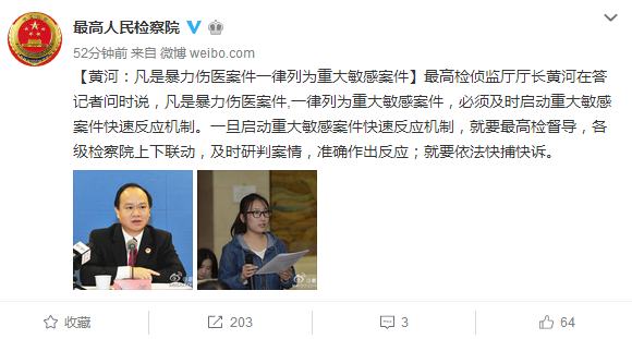 最高檢偵監(jiān)廳廳長(zhǎng)黃河今日在答記者問(wèn)時(shí)說(shuō),凡是暴力傷醫(yī)案件,一律列為重大敏感案件,必須及時(shí)啟動(dòng)重大敏感案件快速反應(yīng)機(jī)制。一旦啟動(dòng)重大敏感案件快速反應(yīng)機(jī)制,就要最高檢督導(dǎo),各級(jí)檢察院上下聯(lián)動(dòng),及時(shí)研判案情,準(zhǔn)確作出反應(yīng);就要依法快捕快訴。