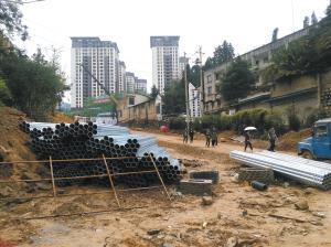 記者來到該小區(qū),通往該小區(qū)的主干道還未鋪路,黃土路一片泥濘,鋼筋、管材堆放在一旁,小區(qū)仍在施工中。