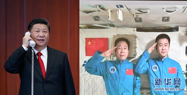 11月9日下午16時20分,中共中央總書記、國家主席、中央軍委主席習近平走進中國載人航天工程指揮中心,在指揮席就座。他注視著大屏幕,仔細觀看景海鵬、陳冬兩位航天員在天宮二號內(nèi)的試驗操作。16時25分,景海鵬、陳冬到視頻通話位置并排站立,天地對話開始。
