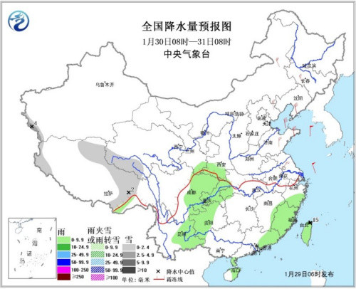 29日08時(shí)至30日08時(shí),西藏西部、南疆西部、黃淮大部、東北地區(qū)東部等地有小到中雪或雨夾雪,吉林東部的局地有大雪;西南地區(qū)東部、江漢大部、江淮、江南西部和東部、華南東部等地有小雨,局地中雨。內(nèi)蒙古中西部、東北地區(qū)中南部、華北、黃淮、江淮等地有4~6級(jí)風(fēng)(見(jiàn)圖2)。渤海、黃海、東海有7~8級(jí)、陣風(fēng)9級(jí)的偏北或東北風(fēng)。