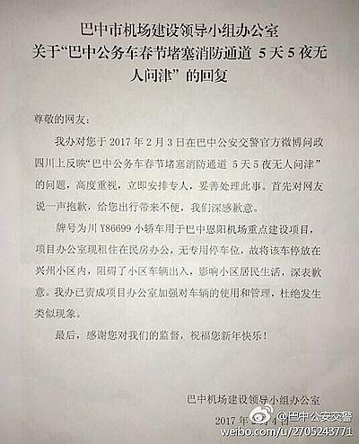 2月4日,巴中公安交警在“問政四川”平臺(tái)回復(fù)稱,巴中市機(jī)場建設(shè)領(lǐng)導(dǎo)小組辦公室對(duì)網(wǎng)友反映的“巴中公務(wù)車春節(jié)堵塞消防通道5天5夜無人問津”一事作出回應(yīng);貜(fù)稱,經(jīng)調(diào)查發(fā)現(xiàn),該車用于巴中市恩陽機(jī)場重點(diǎn)建設(shè)項(xiàng)目,由于項(xiàng)目辦公室現(xiàn)租住在民房辦公,無專用停車位,故將車輛停放在興州小區(qū)內(nèi),阻礙了小區(qū)車輛出入,影響了小區(qū)居民生活。