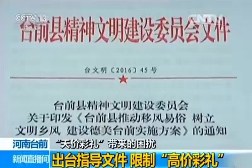2016年年底,河南省臺前縣下發(fā)《臺前縣農(nóng)村紅白事標準參照指導意見(征求意見稿)》等文件,對農(nóng)村彩禮提出了參照標準,要求彩禮總數(shù)控制在6萬元以內(nèi)。