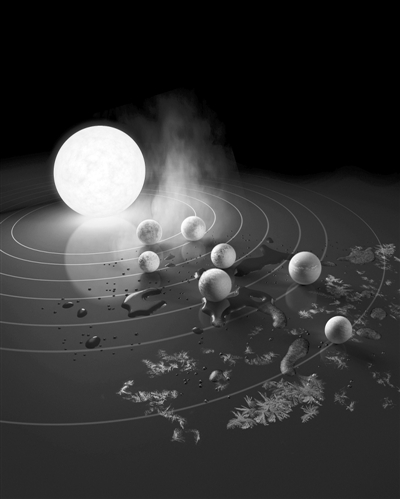 這張NASA發(fā)布的概念圖顯示的是單一恒星TRAPPIST-1及圍繞其運行的7顆系外行星。天文學(xué)家認(rèn)為,這一酷似太陽系的行星系,堪稱迄今尋找外星生命的最佳地點。