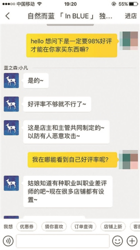 一家名為“自然而藍”的店鋪主營服裝類商品,北青報記者以顧客身份進行詢問,客服稱,買家發(fā)出的好評率要在98%以上,才可以在店中購買!昂迷u率不夠就不行了,這也是店主和主管共同制定的,以防有人惡意攻擊!笨头藛T稱,目前有很多家店鋪都有類似設置,“因為有種行當叫職業(yè)差評師,所以很多家店鋪都會設置,只是標準不一樣,算是不成文的規(guī)矩。”