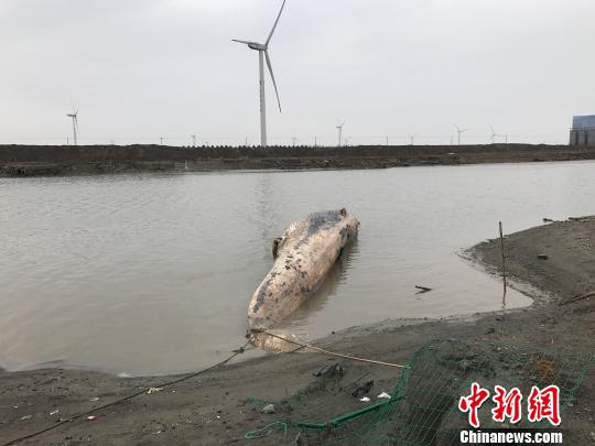 22日一早,中新網(wǎng)記者抵達(dá)位處浦東大治河附近的現(xiàn)場(chǎng)時(shí),殞命鯨魚已在岸上,據(jù)稱,凌晨4時(shí)左右,此間漁政部門借助漲潮,將鯨魚拖上岸。