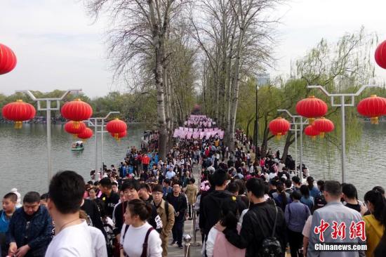 4月2日,清明小長假首日,北京玉淵潭公園迎來賞櫻、踏青高峰。圖為公園內(nèi)游客眾多。中新社記者 李慧思 攝