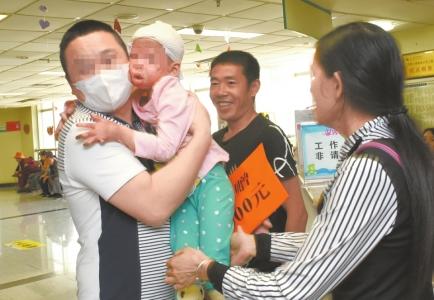 幾分鐘后,豪豪的父親鄧先生從病房走出來,在眾多熱心人士見證下,接過徐榮富送上的3萬元善款,兩個(gè)父親相擁在一起,“謝謝!你們一家也要加油!编囅壬f。