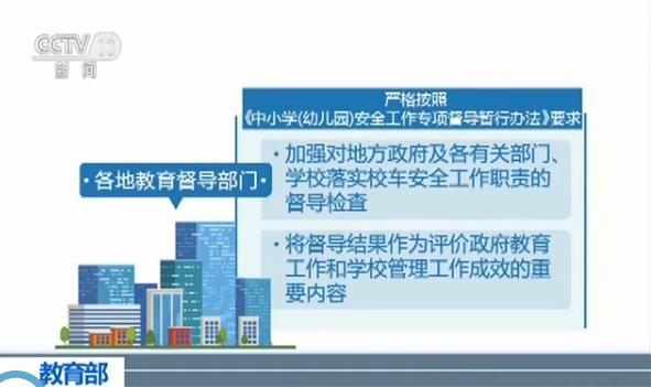 同時,各地教育督導部門要嚴格按照《中小學(幼兒園)安全工作專項督導暫行辦法》的要求,加強對地方政府及各有關(guān)部門、學校落實校車安全工作職責的督導檢查。將督導結(jié)果作為評價政府教育工作和學校管理工作成效的重要內(nèi)容。