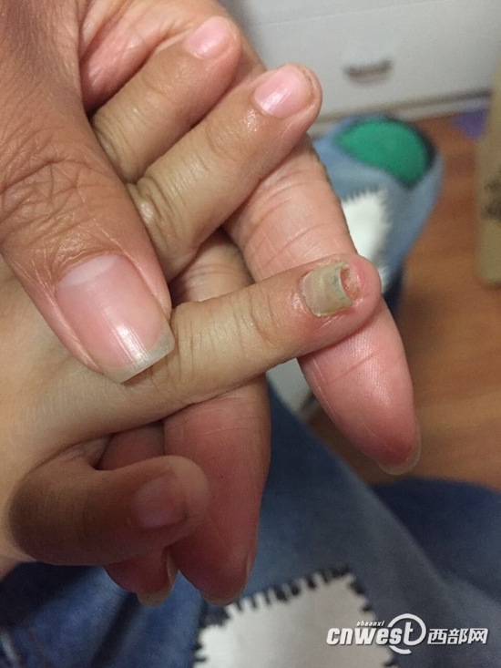 何女士說,“我們跑了幾家醫(yī)院后為了讓孩子少受點(diǎn)罪,跟醫(yī)生商量選擇保守治療,直到5月4日孩子的整個(gè)指甲翻起脫落!