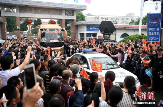 6月5日上午,安徽毛坦廠中學(xué)考生出發(fā),萬(wàn)余民眾冒雨相送。8時(shí)08分,28輛大巴車(chē)從毛坦廠校園緩緩開(kāi)出,毛坦廠鎮(zhèn)過(guò)萬(wàn)民眾夾道歡送。 中新社記者 韓蘇原 攝