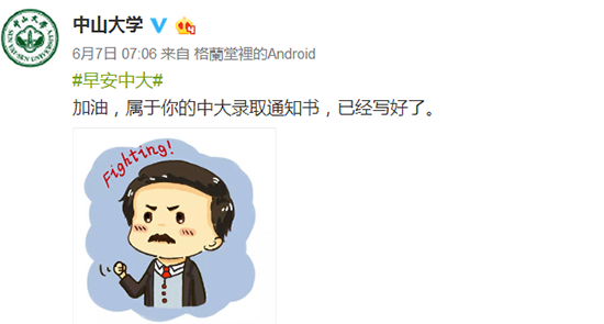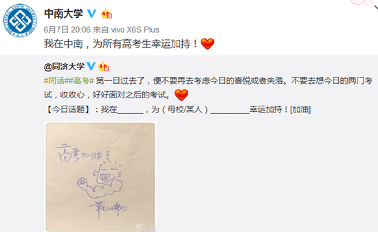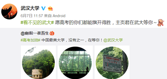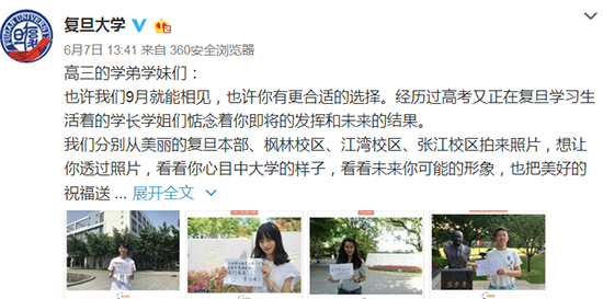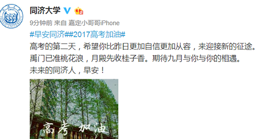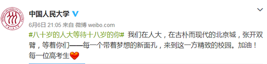 人民網(wǎng)北京6月8日電 一年一度的高考鐘聲已于昨日再次在全國(guó)各地敲響,940萬考生在火熱的六月迎戰(zhàn)生命中一場(chǎng)重要的考驗(yàn)。值此之際,北京大學(xué)、人民大學(xué)、復(fù)旦大學(xué)、武漢大學(xué)等高校紛紛通過官方微博為高考考生獻(xiàn)上祝福和鼓勵(lì):愿你沉著自信奔赴戰(zhàn)場(chǎng),祝你旗開得勝金榜題名,我們?cè)诖髮W(xué)等你!