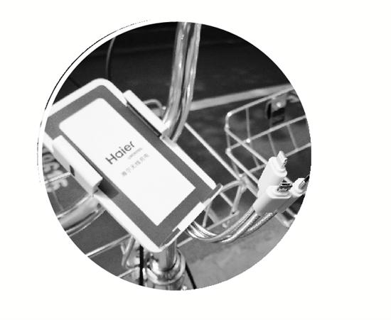 與有些單車不一樣的是,“土豪金”單車車前還有一個(gè)充電寶,并搭載了三種不同接口的充電線。這款特別的“充電寶”只能在騎行時(shí),才可以為手機(jī)等移動電子設(shè)備充電,并且自帶手機(jī)支架及三款常見的數(shù)據(jù)線。