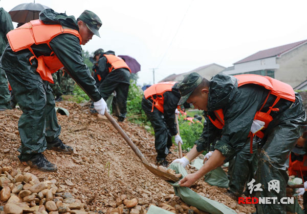 6月30日傍晚17時,在益陽市資陽區(qū)新橋河鎮(zhèn),多處河堤出現(xiàn)管涌險情,益陽支隊支隊長戴國兵帶領(lǐng)200余名官兵緊急前往現(xiàn)場,對管涌險情處采取檢查、清理、封堵等措施,經(jīng)過20多個小時的晝夜奮戰(zhàn),成功封堵管涌18處,加固河堤300余處。