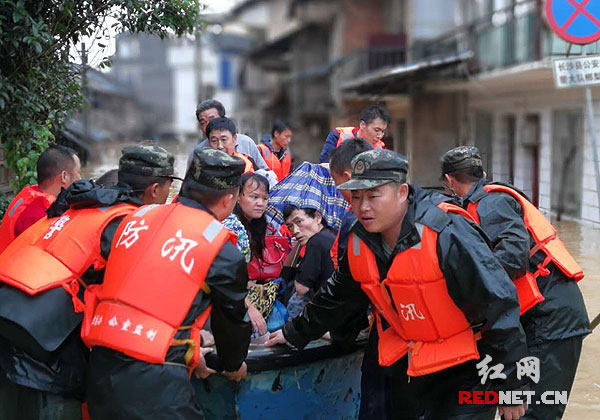 下午14時,長沙縣榔梨街道陶公廟再傳險情,數(shù)百名群眾被困在居民樓內(nèi)。長沙支隊200余名前線救災(zāi)官兵駕駛沖鋒舟前往受災(zāi)最嚴(yán)重的地區(qū),挨家挨戶進(jìn)行搜救,成功將300余名被困群眾轉(zhuǎn)移到安全區(qū)域。18時30分,前方傳來最新消息,瀏陽河朗梨站水位到達(dá)歷史最高水位,烏山鎮(zhèn)團(tuán)山湖發(fā)生湖水漫堤險情,長沙支隊再次出動150名兵力緊急增援。目前,該支隊已在此地奮戰(zhàn)一天一夜,累計轉(zhuǎn)移2000余名群眾。“武警官兵來了,我們就放心了!”在雨中已持續(xù)奮戰(zhàn)一天總隊近兩千余名官兵將繼續(xù)堅守一線,最大限度降低暴雨所帶來的損失,不負(fù)省委省政府和駐地群眾的重托。