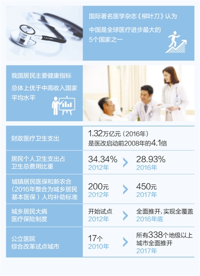 5年來,我國健康水平持續(xù)改善,居民主要健康指標(biāo)總體上優(yōu)于中高收入國家平均水平,人均期望壽命從2010年的74.83歲上升至2016年的76.34歲。較高的健康績效,為全面建成小康社會奠定了重要基礎(chǔ)。世界銀行、世界衛(wèi)生組織認(rèn)為,中國在實(shí)現(xiàn)全民健康覆蓋方面迅速邁進(jìn),改革成就舉世矚目。