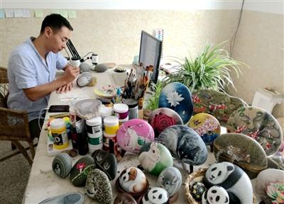 “那段時(shí)間,他一有空就去江邊找石頭!蓖觖愓f,她還經(jīng)常幫著清洗石頭!皹(gòu)思圖案是最難的,要考慮好石頭的大小和樣式。”郝壯介紹說,手繪石頭需要講究細(xì)致,因?yàn)橐习,他只能利用下班后的時(shí)間創(chuàng)作,一般一周才完成一幅作品。