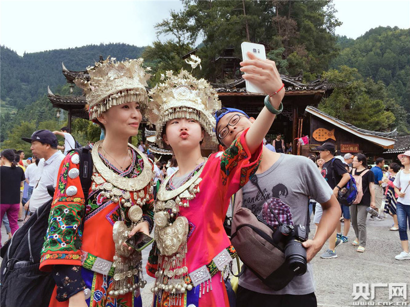 來(lái)自臺(tái)灣師范大學(xué)的劉宛庭是個(gè)帶梨渦的可愛(ài)小姑娘,一到苗寨,她就被當(dāng)?shù)仄恋拿缱宸椢,立馬換上了一套,“就是想穿上感受一下這里的氛圍,苗族的服飾沒(méi)有想象中那么重,裙擺和衣服都是寬松的,就是頭頂?shù)念^飾有點(diǎn)重,但是很漂亮!