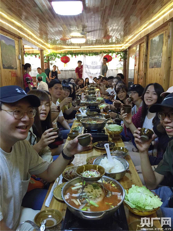 在苗寨,選手們還體驗(yàn)了一把當(dāng)?shù)氐摹伴L(zhǎng)桌宴”,28位選手面對(duì)面排開(kāi),吃起了苗族最有特色的酸湯魚!澳阆矚g也要喝,不喜歡也要喝,管你喜歡不喜歡也要喝”,當(dāng)?shù)責(zé)崆榈拿缱骞媚锍鴦窬聘,端著米酒向選手聚攏,用苗族特有的高山流水式的倒酒法,給了選手們一個(gè)特別的體驗(yàn)。來(lái)自北京大學(xué)的臺(tái)灣學(xué)生吳桐被這架勢(shì)嚇了一跳,“四個(gè)壺接力式地像高山流水一樣向我倒來(lái),我感覺(jué)喝了足足有幾分鐘,不過(guò)感覺(jué)還蠻好喝的,就是喝完有些暈哈哈!