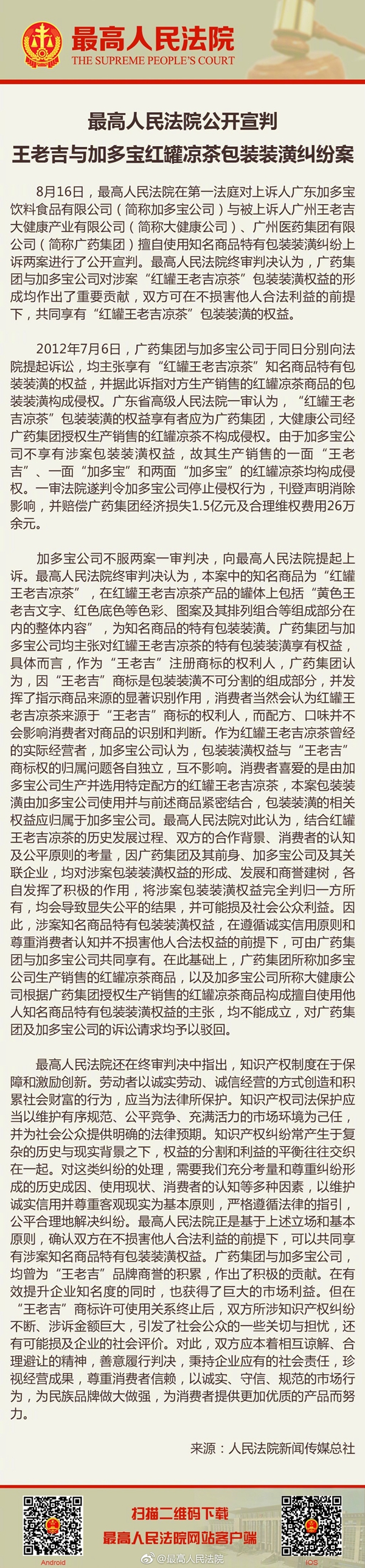 最高人民法院今天在第一法庭對上訴人廣東加多寶飲料食品有限公司(簡稱加多寶公司)與被上訴人廣州王老吉大健康產(chǎn)業(yè)有限公司(簡稱大健康公司)、廣州醫(yī)藥集團(tuán)有限公司(簡稱廣藥集團(tuán))擅自使用知名商品特有包裝裝潢糾紛上訴兩案進(jìn)行了公開宣判。最高人民法院終審判決認(rèn)為,廣藥集團(tuán)與加多寶公司對涉案“紅罐王老吉涼茶”包裝裝潢權(quán)益的形成均作出了重要貢獻(xiàn),雙方可在不損害他人合法利益的前提下,共同享有“紅罐王老吉涼茶”包裝裝潢的權(quán)益。(新民晚報(bào) 潘子璇)