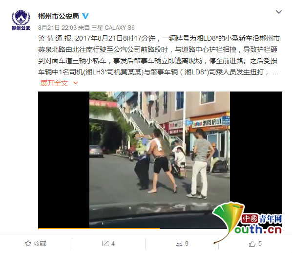 通報(bào)中披露了此事的更多細(xì)節(jié):2017年8月21日8時(shí)17分許,一輛牌號(hào)為湘LD8*的小型轎車沿郴州市燕泉北路由北往南行駛至公汽公司前路段時(shí),與道路中心護(hù)欄相撞,導(dǎo)致護(hù)欄砸到對(duì)面車道三輛小轎車,事發(fā)后肇事車輛立即逃離現(xiàn)場(chǎng),停至前進(jìn)路。