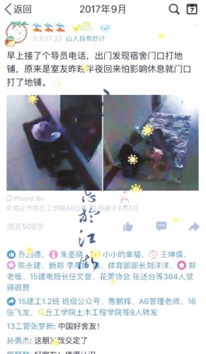 近日,一則關于商丘工學院“學生返校晚,怕打擾室友,門口打地鋪”的新聞,在朋友圈大量轉(zhuǎn)發(fā),上面配有幾張打地鋪的圖片。