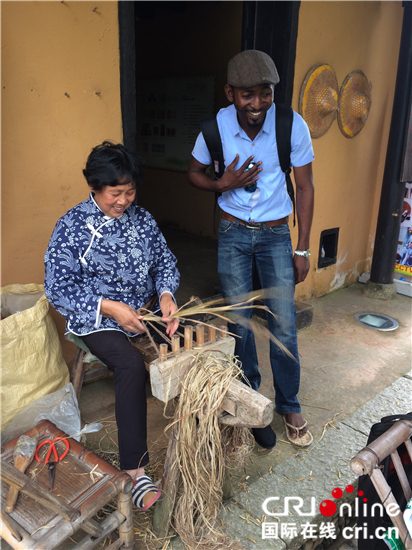 茨坪毛澤東舊居景點一位農(nóng)婦給游客示范草鞋的穿法