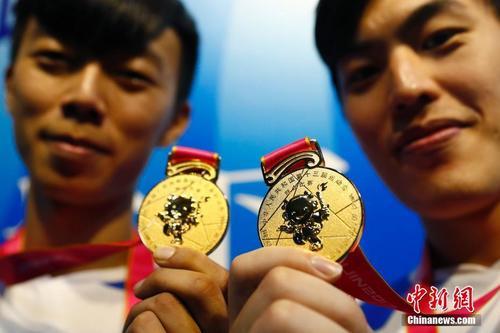 天津全運(yùn)會(huì)羽毛球群眾比賽男雙A組,中國臺灣地區(qū)組合何致穎(右)、王翔羿奪得冠軍。 中新社記者 富田 攝