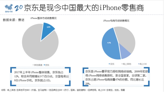 隨著蘋果iPhone新品發(fā)布會的臨近,權(quán)威調(diào)研機構(gòu)賽諾數(shù)據(jù)發(fā)布了《2017年1-6月iPhone中國銷售數(shù)據(jù)報告》,根據(jù)報告中提供的數(shù)據(jù)顯示,在中國市場線上購買iPhone產(chǎn)品已經(jīng)成為主流,所有線上銷售渠道中,京東以47%的份額占據(jù)行業(yè)第一,同比增長28%,這意味著中國市場所有線上售賣iPhone,每兩臺就有一臺是在京東平臺售出,成為iPhone在中國最大的零售商。