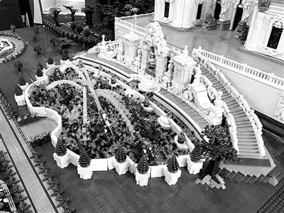 10月20日,“大水法”模型制作團隊的負責(zé)人王先生告訴北青報記者,他們是從今年開始籌備用積木復(fù)原圓明園這一項目的,耗時半年,目前已經(jīng)完成觀水法、大水法、遠瀛觀部分的搭建,共使用了約66萬塊積木,模型沙盤所占面積為4.47平方米。