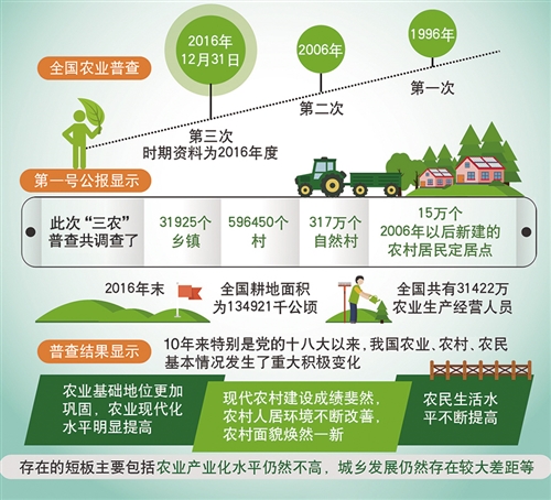 自2015年6月份起,國(guó)務(wù)院決定開(kāi)展第三次全國(guó)農(nóng)業(yè)普查。此次普查的標(biāo)準(zhǔn)時(shí)點(diǎn)為2016年12月31日,時(shí)期資料為2016年度,共調(diào)查了31925個(gè)鄉(xiāng)鎮(zhèn),其中鄉(xiāng)11081個(gè),鎮(zhèn)20844個(gè);596450個(gè)村,其中556264個(gè)村委會(huì),40186個(gè)涉農(nóng)居委會(huì);317萬(wàn)個(gè)自然村;15萬(wàn)個(gè)2006年以后新建的農(nóng)村居民定居點(diǎn)。