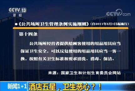 董倩:作為住店的客人,我們都有一個(gè)希望,就是不管它是有星還是沒星,有星的話是幾星,都希望它能夠干凈、能夠消毒。那么對(duì)于這樣一種愿望,我們國家有沒有相應(yīng)的規(guī)定。有,我們來看一下。這是我們國家有一個(gè)《公共場所衛(wèi)生管理?xiàng)l例實(shí)施細(xì)則》,從11年5月就開始施行了,且實(shí)施了。其中有一個(gè)第十四條,里面明文寫道,公共場所經(jīng)營者提供給顧客使用的用品用具應(yīng)當(dāng)保證衛(wèi)生安全,可以反復(fù)使用的用品用具應(yīng)當(dāng)一客一換,按照有關(guān)衛(wèi)生標(biāo)準(zhǔn)和要求清洗、消毒、保潔。