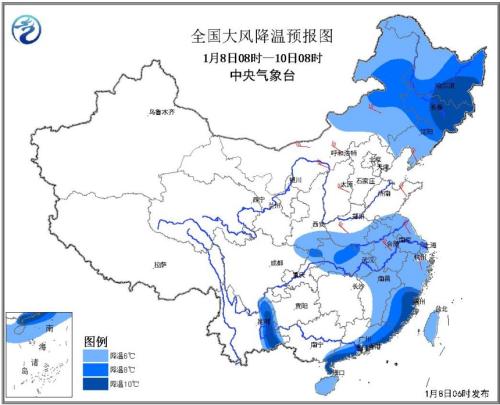 中新網(wǎng)1月8日電 中央氣象臺(tái)今日6時(shí)繼續(xù)發(fā)布寒潮藍(lán)色預(yù)警:受較強(qiáng)冷空氣影響,8至9日,陜西南部、黃淮南部、江漢、江淮、江南中東部、華南中東部、云南東部以及內(nèi)蒙古中東部、東北地區(qū)大部等地氣溫將下降6~8℃。