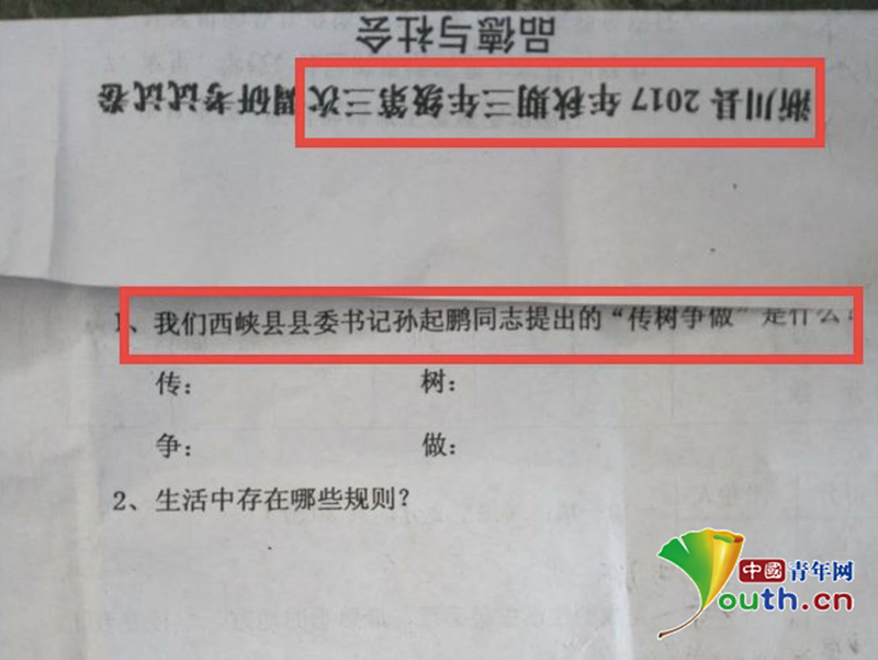 一名家長(zhǎng)整理的試卷圖片顯示,淅川縣與西峽縣多份試卷試題大范圍雷同。一份小學(xué)三年級(jí)的《品德與社會(huì)》試卷中要求學(xué)生回答“我們西峽縣縣委書(shū)記孫起鵬同志提出的‘傳樹(shù)爭(zhēng)做’是什么?生活中存在哪些規(guī)則?”。除此以外,試卷中還有多道西峽特色顯著的題目。