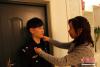 年初一早上,母親為即將踏上行程的孔令揚(yáng)整理著裝。這位平凡的母親,在萬(wàn)家團(tuán)圓的日子,和丈夫及兒子都是聚少離多。胡宏 攝 -