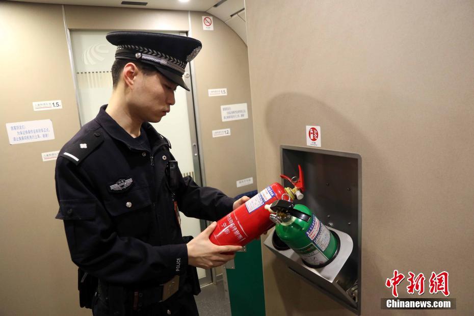 孔令揚(yáng)在列車上檢查消防安全設(shè)施。胡宏 攝 -