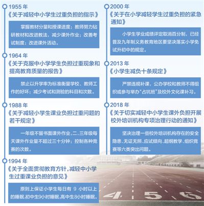 為什么會這樣?其實,自1955年7月教育部發(fā)出新中國第一個“減負令”——《關(guān)于減輕中小學生過重負擔的指示》以來,60余年間我國中央及地方相關(guān)部門出臺的學生“減負令”多達上百道,圍繞學習時間、考核方式、教材內(nèi)容、課外活動、教師水平、學校領(lǐng)導等方面做出了一系列細致嚴謹?shù)囊?guī)定。