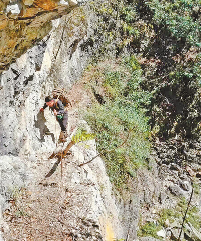 神農(nóng)架國家公園管護人員在森林資源二類清查行動中穿越陰峪河大峽谷。