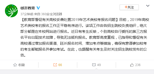目前,2019年高校藝術類校考的報名工作正平穩(wěn)有序進行。該項工作由各招生院校負責組織,絕大部分都是在本校網(wǎng)站進行報名。近日有考生反映,個別高校自行委托的第三方報名平臺出現(xiàn)技術故障,導致無法順利報名。教育部高度重視,已指導和督促有關高校通過增加報名渠道、延長報名時間、增加考點等措施,確保有意愿參加?嫉目忌寄軋竺⒓涌荚嚒T诖,也提醒有關考生及時關注招生院校發(fā)布的公告。