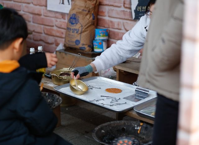2月5日,在韓國京畿道龍仁市的韓國民俗村,小朋友觀看制作傳統(tǒng)的糖餅。