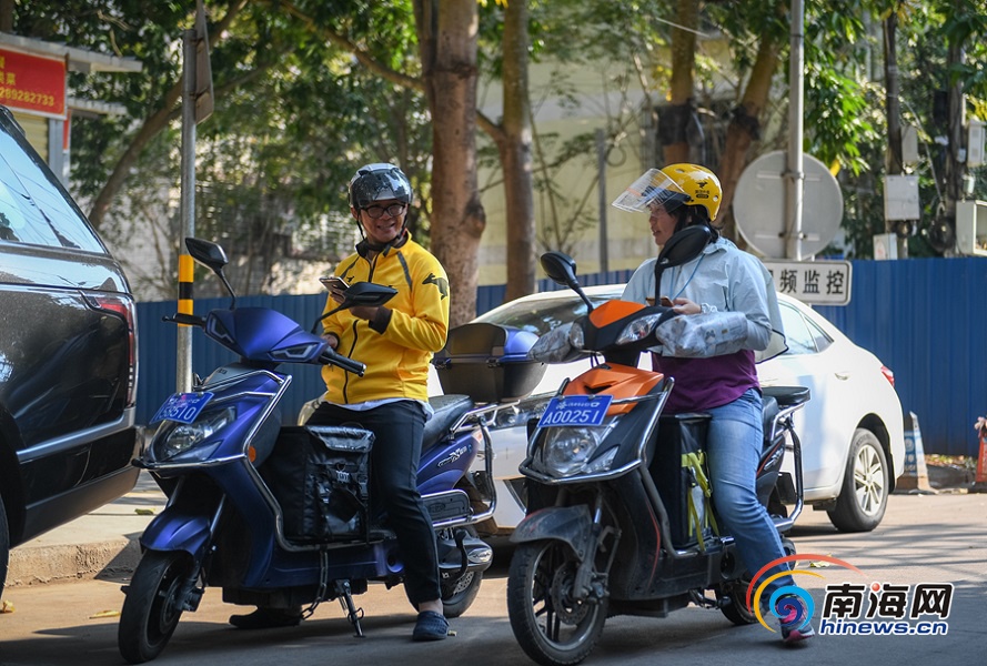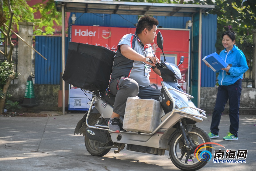2019年2月8日,海口市金星路,快遞員給顧客送物品。海報(bào)全媒體中心記者 袁琛 攝