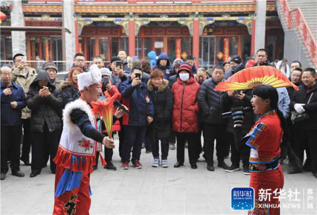 ↑2月10日,民間藝人在山西大同市潘家園古玩市場(chǎng)表演二人臺(tái)。(任雪峰 攝)
