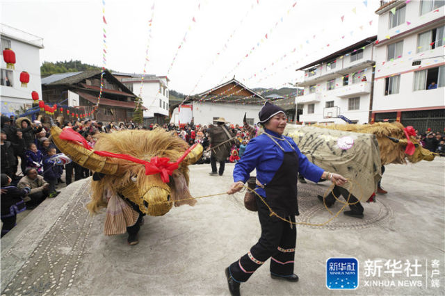 ↑2月10日,在廣西龍勝各族自治縣平等鎮(zhèn)廣南村,村民表演“鬧春牛”。(黃勇丹 攝)