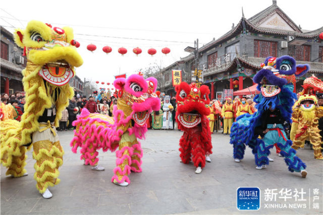 ↑2月10日,民間藝人在河北邯鄲市廣府古城廟會(huì)上表演舞獅。(楊揚(yáng) 攝)
