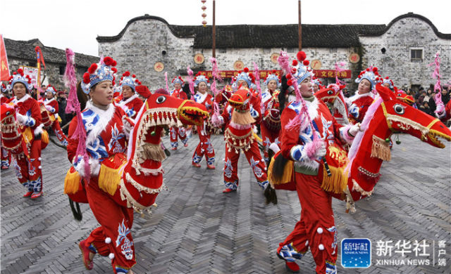 ↑ 2月10日,在浙江臺(tái)州市仙居縣埠頭鎮(zhèn)樓下王村,村民表演傳統(tǒng)民俗“跳跳馬”。(王華斌 攝)