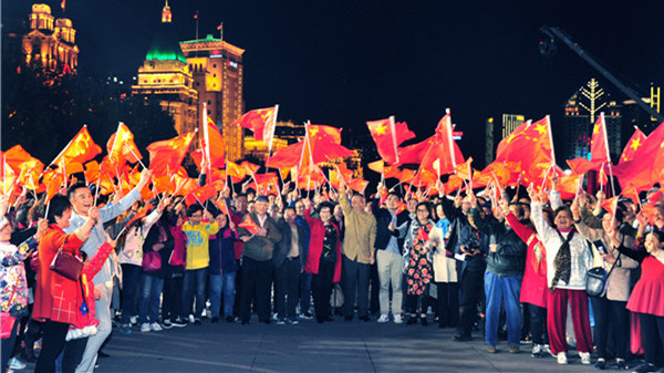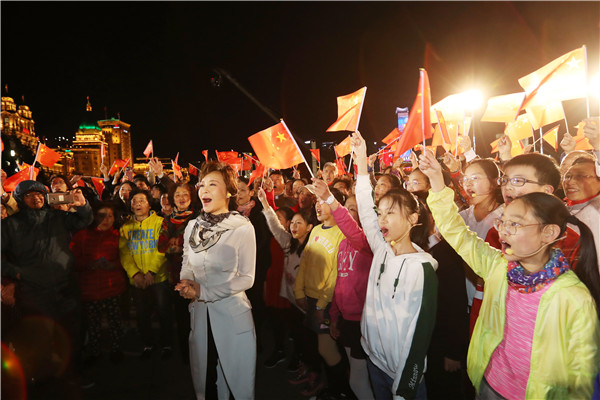 快閃現(xiàn)場(chǎng),觀眾們激動(dòng)地?fù)]動(dòng)國(guó)旗。