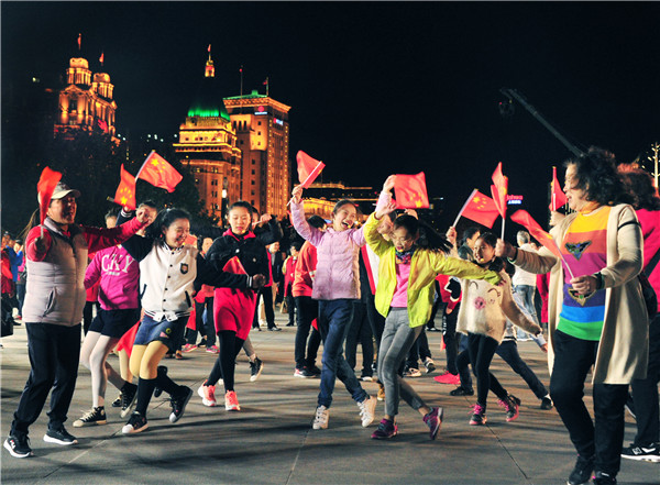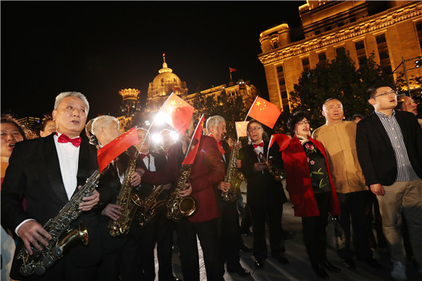 昆曲藝術(shù)家張軍、新聞主播葉蓉、和平飯店爵士樂(lè)隊(duì)、黃浦區(qū)勞模代表、春天少年合唱團(tuán)的少年們……出人意料地閃現(xiàn)在人流如梭的外灘,用不同的方式唱響《我和我的祖國(guó)》。外灘成了一片紅色的歡樂(lè)海洋:輪滑少年手執(zhí)國(guó)旗在人群前滑過(guò),江邊和浦江游輪上的人們興奮地互相舞動(dòng)著國(guó)旗,鐘樓在燈光投射下“身披”一面巨型國(guó)旗……越來(lái)越多的游人圍聚過(guò)來(lái)跟著一起高歌,人們拿出手機(jī)記錄下這一特別的時(shí)刻。歌曲結(jié)束時(shí),歡呼聲響徹外灘。“我愛(ài)中國(guó),我愛(ài)上!保⒆觽?nèi)杠S高呼。
